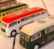 とっても懐かしい感じがするクラシックバスのミニカー。色合いや広告の字体など、ディティールもいい感じです。ドアのみ手動で開閉可。