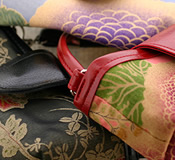 古典古布の素材はとてもさわやかな感触、そしてなんと言っても色の美しさが目を引きます。内側は帆布のとってもしっかりした素材を使用しており、持ち手は皮革製、表の部分にベールのような古典古布を張ってあります。
