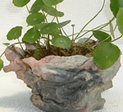 この荒い岩のようなものは実は鉢です。富士山の裾野にころがっている溶岩石みたいに見えます。実に自然に感じなのですが、これ手作りの鉢なのです。