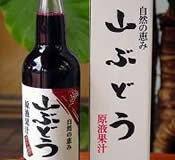 野生の山葡萄を摘み取って絞ったままがこのジュース。栽培された葡萄にはない甘さや酸味や力強さがこのジュースの秘密。焼酎で割って飲んでも美味。