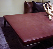 アンティークレザー(合成皮革)を天板に張り込んだちょっとテイストの変わったデザイン。ただ、熱物は避けてください。 |