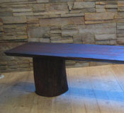 丸太脚の上にラオス松無垢板をのせたテーブル。センターテーブルだけでなくテレビ台としても。 |