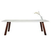 マホガニーのムク材を使用し、全て面取り加工が施されています。斑に特徴があるカラカッタ大理石を使用。シンプルなデザインながらムク材の存在感、ディテイルへのこだわりが際立つ。 |
