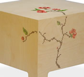 一本一本、慎重に手で編み込まれた十字のステッチ。堅木が刺繍によって柔らかい感触に。 |